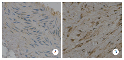 | A, control group; B, POP group. 图 4 免疫组织化学检测2组阴道壁组织中PLA2G2A的表达 ×400 Fig.4 PLA2G2A expression in the vaginal wall tissues between two groups by immunohistochemistry ×400 |