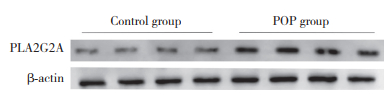 1.2.7 Western boltting检测于-80 ℃冰箱取出对照组和POP组各15例阴道壁提取蛋白,置于SDS-PAGE凝胶中电泳,将PDVF膜浸泡于甲醇中3 s以激活PDVF膜,转膜后5%脱脂牛奶封闭2 h,5%脱脂牛奶稀释一抗(β-actin为1∶500;PLA2G2A为1∶1 000),4 ℃冰箱孵育过夜。次日加入二抗孵育后曝光显影。使用Fiji软件测量各条带灰度值,结果取目的蛋白与β-actin条带灰度值比值。