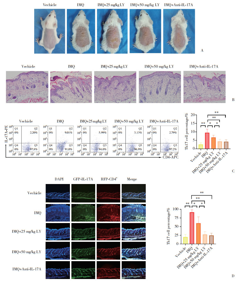 2.3 各组小鼠皮损组织中Th17细胞比例流式细胞术检测结果显示,IMQ组小鼠皮损组织中Th17细胞比例明显高于Vehicle组(P<0.05),LY294002干预后Th17细胞比例显著降低(P均<0.05),以IMQ+50 mg/kg LY组降低更为明显(P<0.05),IMQ+Anti-IL-17A组与IMQ+50 mg/kg LY组比较无统计学差异(P > 0.05,图 1C)。免疫荧光染色检测结果显示,各组小鼠皮损切片中Th17细胞比例与其皮损组织中的Th17细胞比例变化趋势一致,见图 1D。