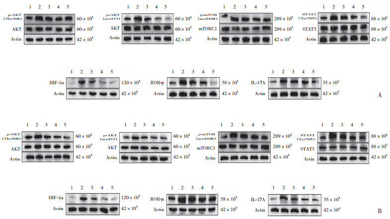 | A, skin; B, spleen tissue. 1, Vechicle group; 2, IMQ group; 3, IMQ+25 mg/kg LY group; 4, IMQ+50 mg/kg LY group; 5, IMQ+Anti-IL-17A group. 图 2 各组小鼠皮肤及脾脏组织中p-AKT(Thr308)、p-AKT(Ser473)、p-mTOR(Ser2448)、p-STAT3(Tyr705)、HIF-1α、RORγt和IL-17A的Western blotting结果 Fig.2 Representative Western blotting results of p-AKT (Thr308), p-AKT (Ser473), p-mTOR (Ser2448), p-STAT3 (Tyr705), HIF-1α, RORγt, and IL-17A in skin and spleen tissues of mice in each group |