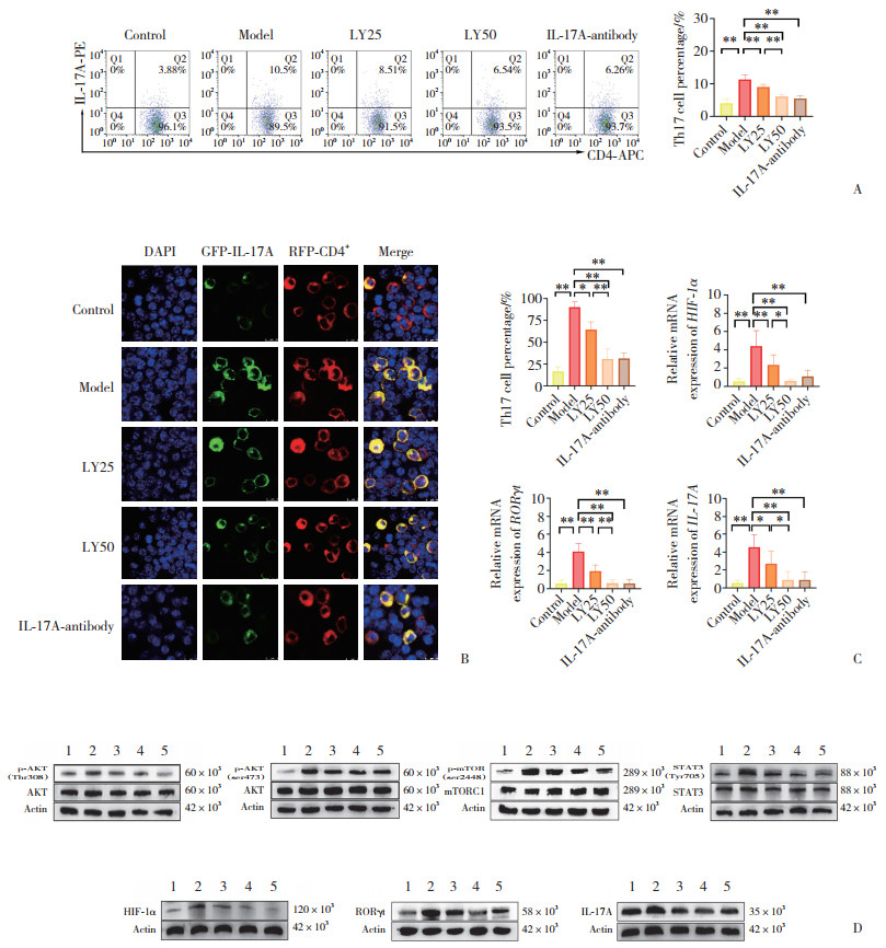 1.2 主要试剂和仪器5%咪喹莫特乳膏(四川明欣药业有限责任公司);LY294002(美国MedChemExpress公司);IL-17A抗体(美国R&D Systems公司、英国abcam公司);二甲基亚砜(dimethyl Sulfoxide,DMSO)、磷酸盐缓冲液(phosphate buffer saline,PBS)、细胞筛网、TRIzol(上海生工生物工程有限公司);小鼠脾脏单个核细胞(spleen mononuclear cell,SMC)分离液试剂盒(天津灏洋生物制品科技有限责任公司);胶原酶Ⅳ(美国sigma-aldrich公司);脱氧核糖核酸酶Ⅰ、苏木素-伊红(hematoxylin and eosin,HE)染色试剂盒、4%多聚甲醛、RIPA裂解液(北京索莱宝科技有限公司);CD3ε、CD28、γ干扰素(interferon-γ,IFN-γ)、IL-4、IL-2抗体(美国Bio X Cell公司);重组IL-1β、转化生长因子β1(transforming growth factor β1,TGF-β1)、IL-6、IL-23,APC-CD4、PE-IL-17A抗体(美国BioLegend公司);佛波酯、布雷非德菌素A、钙离子霉素(美国eBioscience公司);Evo M-MLV反转录预混型试剂盒、SYBR Green Pro Taq HS预混型qPCR试剂盒(湖南艾科瑞生物工程有限公司);AKT、p-AKT(Thr308)、p-AKT(Ser473)、mTORC1、p-mTOR(Ser2448)抗体(美国Cell Signaling公司);STAT3、p-STAT3(Tyr705)、β-actin抗体(武汉爱博泰克生物科技有限公司);HIF-1α抗体、DyLight 549及DyLight 488标记IgG [亚科因(武汉)生物技术有限公司];RORγt抗体(武汉三鹰生物技术有限公司);CD4抗体(美国Santa公司);CFX96 TouchTM Real-Time PCR检测系统(美国Bio-Rad公司);激光共聚焦显微镜(德国Leica公司)。