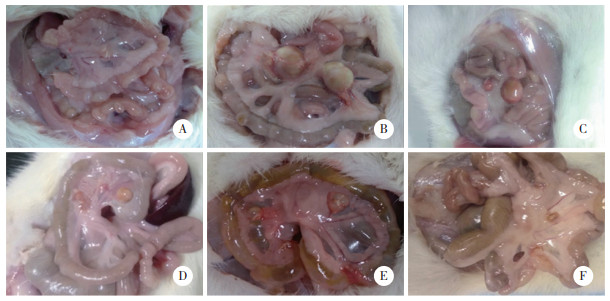 | A, normal group; B, EMT group; C, L-NOB group; D, H-NOB group; E, PUR group; F, CYC group. 图 1 各组大鼠异位病灶观察结果 Fig.1 Observation results of ectopic lesions in each group of rats |