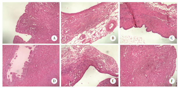 | A, normal group; B, EMT group; C, L-NOB group; D, H-NOB group; E, PUR group; F, CYC group. 图 2 各组大鼠子宫内膜组织病理学形态HE×100 Fig.2 The histological morphology of the endometrium of rats in each group HE×100 |