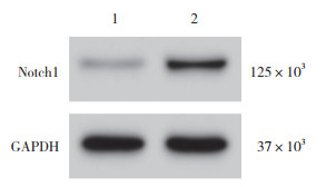 | 1, normal endometrial tissue; 2, ectopic endometrial tissue. 图 1 Western blotting检测子宫内膜组织中Notch1蛋白表达结果 Fig.1 Notch1 expression in endometrial tissue by Western blotting |