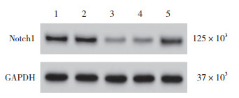 | 1, Control group; 2, miR-NC group; 3, miR-200c-3p-OE group; 4, miR-200c-3p-OE+pc-NC group; 5, miR-200c-3p-OE+pc-Notch1 group. 图 2 Western blotting各组EESC中Notch1蛋白表达 Fig.2 Notch1 expression of EESC in each group by Western blotting |