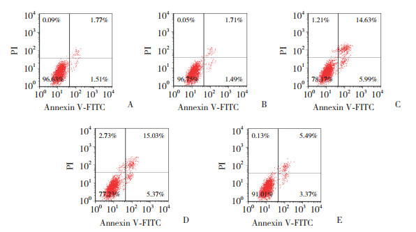 | A, Control group; B, miR-NC group; C, miR-200c-3p-OE group; D, miR-200c-3p-OE+pc-NC group; E, miR-200c-3p-OE+pc-Notch1 group. 图 3 各组EESC凋亡情况 Fig.3 Apoptosis status of EESC in each group |