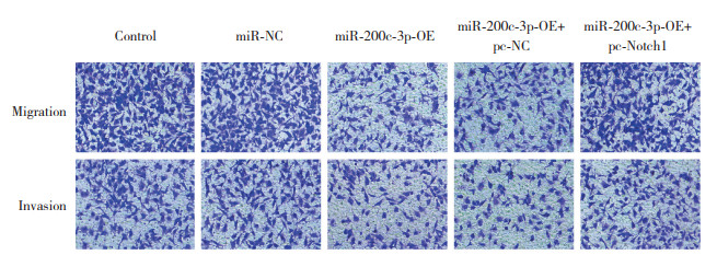 与Control组、miR-NC组比较,miR-200c-3p-OE组细胞迁移和侵袭数降低(P < 0.05);与miR-200c-3p-OE组、miR-200c-3p-OE+pc-NC组比较,miR-200c-3p-OE+pc-Notch1组细胞迁移和侵袭数升高(P < 0.05)。见图 4、表 3。