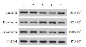| 1, Control group; 2, miR-NC group; 3, miR-200c-3p-OE group; 4, miR-200c-3p-OE+pc-NC group; 5, miR-200c-3p-OE+pc-Notch1 group. 图 5 各组EESC上皮-间质转化相关蛋白的Western blotting检测结果 Fig.5 Western blotting results for epithelial-mesenchymal transition-related proteins of EESC in each group |
