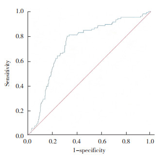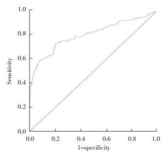 2.7 HOMA-IR预测活产结局的ROC曲线分析ROC曲线分析结果显示,曲线下面积为0.804(95%CI:0.764~0.843,P < 0.001)。HOMA-IR截断值为3.27,灵敏度为0.728,特异度为0.794。见图 2。
