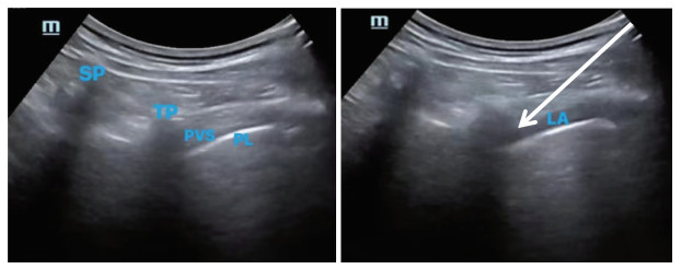 | SP, spinous process; TP, transverse process; PVS, paravertebral space; PL, pleura; LA, local anesthetic. The arrow shows the route of needle insertion. 图 1 椎旁间隙超声下图像 Fig.1 Ultrasound image of the paravertebral space |
