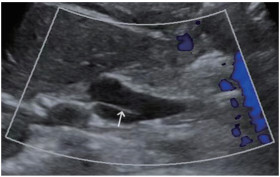 | 箭头所示为胆总管内条带状回声. 图 1 首次超声检查图像 |