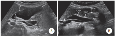 | A,与胆囊(GB)相连接冗长扩张的胆囊管(CD);B,胆囊管(CD)与扩张的肝总管(CHD)伴行,最终汇合成胆总管(CBD)进入胰头(PAH). 图 2 复查超声图像 |