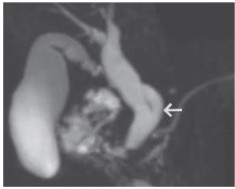 | 肝外胆管扩张. 箭头所示为胆囊管低位汇入,汇入点位于肝外胆管左侧壁. 图 3 3D-MRCP检查图像 |