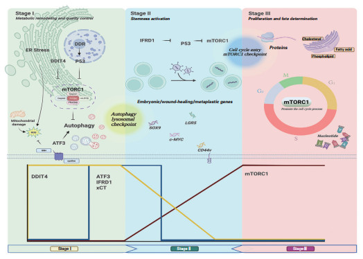 随着自降解阶段的消退,逆生细胞进入下一阶段,核心特征为原有分化状态解除与再生能力激活。此时,mTORC1信号逐步恢复,并与干细胞相关基因表达的激活密切相关[12]。例如,胃主细胞会舍弃分化标志p57和MIST1,转而表达CD44v、SOX9、LGR5和c-MYC等干样因子[13-14],实现细胞谱系内的转换,满足组织修复需求。事实上,胃主细胞、胰腺腺泡细胞等高度分化的成熟细胞,在特定损伤情境下,都能退回到具有再生潜力的中间状态[6, 15]。此阶段的关键分子是干扰素相关发育调节因子1 (interferon-related developmental regulator 1,IFRD1),其在多个逆生模型中表达上调,并在促进mTORC1信号重激活中发挥重要作用[12]。IFRD1通过特异性抑p53,解除其对mTORC1的抑制作用,驱动细胞周期重启与功能性增殖[11]。