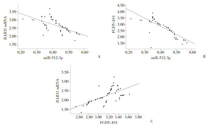| A, correlation between the expression of miR-512-3p and RAB31 mRNA in bladder cancer tissues; B, correlation between miR-512-3p and FGD5-AS1 expression in bladder cancer tissues; C, correlation between the expression of FGD5-AS1 and RAB31 mRNA in bladder cancer tissues. 图 1 膀胱癌组织中miR-512-3p与FGD5-AS1、RAB31 mRNA表达的相关性 Fig.1 Correlation between miR-512-3p and the expressions of FGD5-AS1 and RAB31 mRNA in bladder cancer tissues |