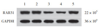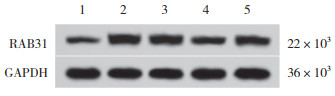 | 1, SV-HUC-1;2, T24;3, 5637;4, KU-19-19;5, UM-UC-3. 图 2 膀胱癌细胞中RAB31蛋白表达 Fig.2 Expression of RAB31 protein in bladder cancer cells |
