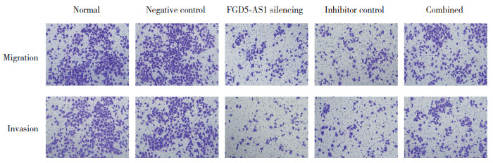 2.5 各组T24细胞迁移和侵袭比较与正常组、阴性对照组相比,FGD5-AS1沉默组迁移和侵袭细胞数降低(P < 0.05);与FGD5-AS1沉默组、抑制剂对照组比较,联合组迁移和侵袭细胞数升高(P < 0.05)。见图 4、表 5。