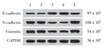 | 1, normal group; 2, negative control group; 3, FGD5-AS1 silencing group; 4, inhibitor control group; 5, combined group. 图 5 各组T24细胞中E-cadherin、N-cadherin、vimentin蛋白表达 Fig.5 Expression of E-cadherin, N-cadherin, and vimentin proteins in T24 cells of each group |