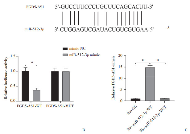 基于互补序列的StarBase数据库预测的FGD5-AS1与miR-512-3p的结合位点见图 6A;miR-512-3p模拟物可显著降低含有FGD5-AS1-WT质粒细胞的萤光素酶活性(P < 0.05,图 6B);RNA Pull-down实验结果显示,与阴性对照NC和miR-512-3p-MUT探针相比,miR-512-3p-WT生物素探针对FGD5-AS1的富集显著增加(P < 0.05,图 6C)。