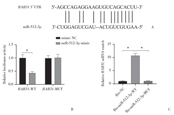 StarBase数据库预测的RAB31 3’UTR与miR-512-3p的结合位点(图 7A);miR-512-3p模拟物可显著降低含有RAB31-WT质粒细胞的萤光素酶活性(P < 0.05,图 7B);RNA Pull-down实验结果显示,miR-512-3p-WT生物素探针可显著富集RAB31 mRNA (P < 0.05,图 7C)。