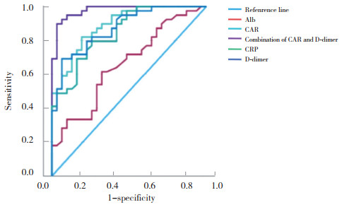 2.3 CAD和D-二聚体的预测效能如表 4、图 1所示,CAR和D-二聚体二者联合预测APIP病情严重程度的AUC值大于单独检测。且二者联合检测预测病情严重程度的诊断效能优于单独检测。