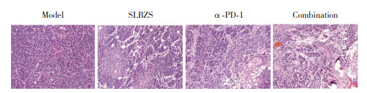 2 结果 2.1 参苓白术散联合α-PD-1抑制荷瘤小鼠肿瘤生长与模型组相比,SLBZS组和α-PD-1组小鼠的肿瘤体积、重量均减少,且SLBZS组和α-PD-1组小鼠的肿瘤体积、重量均高于联合给药组(P < 0.05)。HE染色结果显示,模型组小鼠移植瘤组织细胞大小不等,排列紊乱、细胞核深染,呈现分叶、多核等病理性核分裂。SLBZS组、α-PD-1组和联合给药组小鼠移植瘤组织细胞数量减少、核膜和核仁不清晰,细胞核固缩、碎裂等凋亡特征明显,坏死区域增加,且联合给药组肿瘤组织坏死特征更显著。见表 1、图 1。