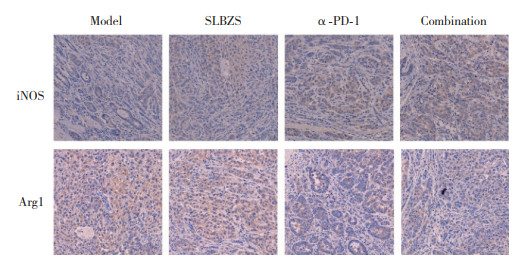 与模型组相比,SLBZS组、α-PD-1组、联合给药组小鼠移植瘤组织中iNOS表达水平升高(P < 0.05),而Arg1表达水平降低(P < 0.05),且SLBZS组和α-PD-1组小鼠移植瘤组织中iNOS表达水平低于联合给药组,Arg1表达水平高于联合给药组(P < 0.05)。提示参苓白术散与α-PD-1在调节巨噬细胞极化方面具有协同作用,联合给药能够更有效地促进M1型巨噬细胞极化并抑制M2型巨噬细胞极化。见表 1、图 2。