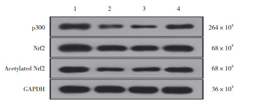 | 1, control group; 2, SLBZS-H group; 3, SLBZS-H+vector group; 4, SLBZS-H+oe-p300 group. 图 3 Western blotting检测HepG2细胞中p300、Nrf2、Nrf2乙酰化水平 Fig.3 Expression levels of p300, Nrf2, and acetylated Nrf2 in HepG2 cells determined by Western blotting |