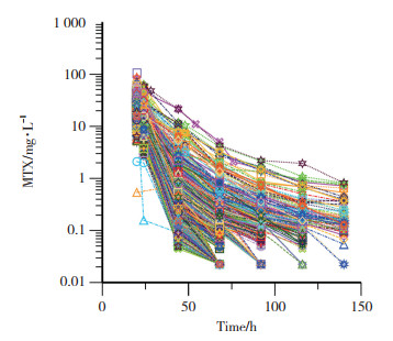 | 图 1 MTX浓度-时间趋势图 Fig.1 Plasma concentration-time profiles of MTX |