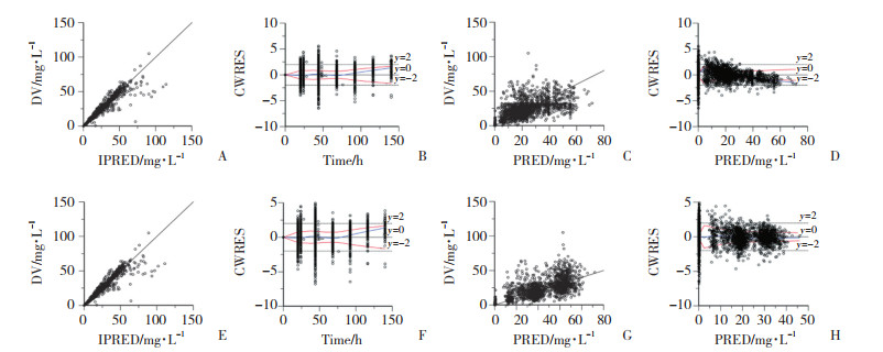 | A, DV-IPRED of base model; B, CWRES-TIME of base model; C, DV-PRED of base model; D, CWRES-PRED of base model; E, DV-IPRED of final mo-del; F, CWRES-TIME of final model; G, DV-PRED of final model; H, CWRES-PRED of final model. DV-IPRED, department variable versus individual predication; CWRES-TIME, conditional weighted residuals versus time; DV-PRED, dependent variable versus population predication; CWRES-PRED, conditional weighted residuals versus population prediction. 图 2 基础模型与最终模型的拟合优度图 Fig.2 Comparison of goodness-of-fit diagnostics between the base model and the final model |