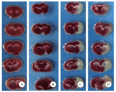 | A, Sham group; B, running group; C, I/R group; D, running+I/R group. 图 1 各组小鼠缺血半影区TTC染色 Fig.1 TTC staining of the ischemic penumbra in each group of mice |