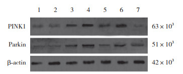 | 1, Sham group; 2, running group; 3, I/R group; 4, running+I/R group; 5, running+I/R+3-MA group; 6, running+I/R+scramble siRNA group; 7, running+I/R+HSPA5 siRNA group. 图 2 各组小鼠缺血半影区PINK1和Parkin蛋白表达 Fig.2 Expression of PINK1 and Parkin proteins in the ischemic penumbra of mice in each group |