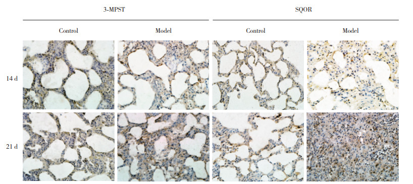 1.4 方法 1.4.1 免疫组织化学染色采用免疫组织化学染色检测大鼠肺组织中3-MPST和SQOR的表达。组织固定、包埋、切片后,一抗(3-MPST,1∶50;SQOR,1∶400)孵育,DAB显色,苏木素复染,光镜下棕黄色颗粒判定为阳性信号。