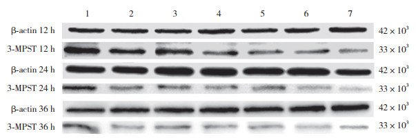 | 1,control group;2,TGF-β1 goup;3,TGF-β1+NaHS group;4,siRNA-3-MPST group;5,siRNA-3-MPST+TGF-β1 group;6,siRNA-SQOR group;7,siRNA-SQOR+TGF-β1 group. 图 2 各组A549细胞中3-MPST蛋白的表达 Fig.2 Expression of 3-MPST protein in A549 cells in each group |