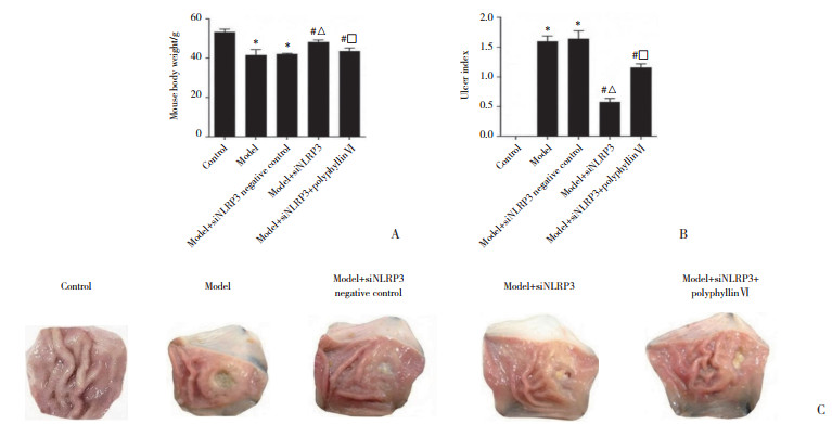 与对照组比较,模型组小鼠体重减少,溃疡指数增加(P < 0.05)。与模型组比较,模型+siNLRP3阴性对照组小鼠体重及溃疡指数差异无统计学意义(P > 0.05)。与模型+siNLRP3阴性对照组比较,模型+siNLRP3组小鼠的体重增加,溃疡指数减少(P < 0.05)。与模型+siNLRP3组比较,模型+siNLRP3+polyphyllin Ⅵ组小鼠体重减少,溃疡指数增加(P < 0.05)。见图 2。
