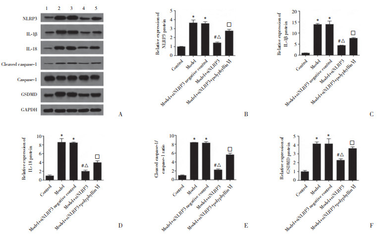 与对照组比较,模型组和模型+siNLRP3阴性对照组NLRP3、IL-1β、IL-18、GSDMD蛋白表达以及cleaved caspase-1/caspase-1比值均显著升高(P < 0.05);与模型组和模型+siNLRP3阴性对照组比较,模型+siNLRP3组NLRP3、IL-1β、IL-18、GSDMD蛋白表达以及cleaved caspase-1/caspase-1比值均明显降低(均P < 0.05)。与模型+siNLRP3组比较,模型+siNLRP3+polyphyllinⅥ组NLRP3、IL-1β、IL-18、GSDMD蛋白表达以及cleaved caspase-1/caspase-1比值明显升高(P < 0.05)。见图 3。