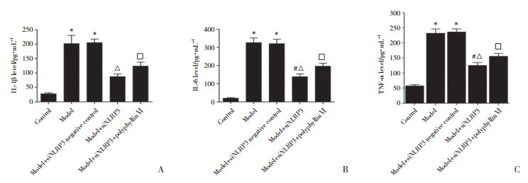 与对照组比较,模型组小鼠血清IL-1β、IL-6、TNF-α水平升高(P < 0.05)。与模型组比较,模型+siNLRP3阴性对照组小鼠血清IL-1β、IL-6、TNF-α水平差异无统计学意义(P > 0.05)。与模型+siNLRP3阴性对照组比较,模型+siNLRP3组血清IL-1β、IL-6、TNF-α水平下降(P < 0.05)。与模型+siNLRP3组比较,模型+siNLRP3+polyphyllin Ⅵ组小鼠血清IL-1β、IL-6、TNF-α水平升高(P < 0.05)。见图 4。