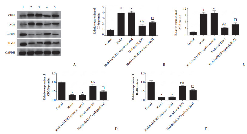 与对照组比较,模型组小鼠体内CD86及iNOS表达增加,而CD206及IL-10表达减少(P < 0.05)。与模型组比较,模型+siNLRP3阴性对照组的CD86及iNOS、CD206及IL-10表达比较差异均无统计学意义(P > 0.05)。与模型+siNLRP3阴性对照组比较,模型+siNLRP3组CD86及iNOS表达减少,而CD206及IL-10表达增加(均P < 0.05)。与模型+siNLRP3组比较,模型+siNLRP3+polyphyllinⅥ组CD86及iNOS表达增加,而CD206及IL-10表达减少(均P < 0.05)。见图 5。