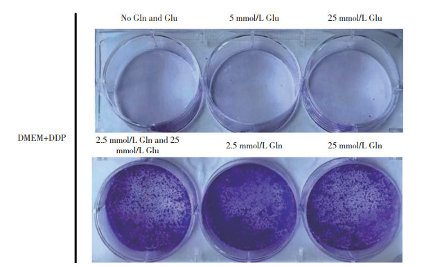 | Gln, glutamine; Glu, glucose; DDP, cis-dichlorodiammine plalinum (Ⅱ). 图 1 克隆形成实验检测A549细胞的集落形成情况 Fig.1 The colony formation of A549 cells cultured through the colony formation assay |