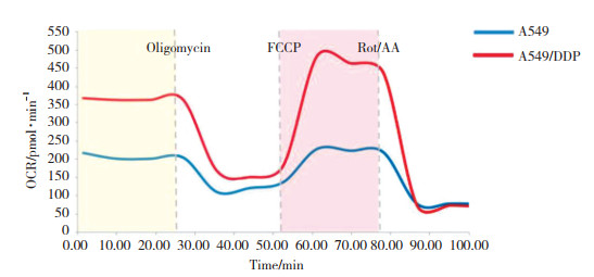 | FCCP, carbonyl cyanide 4-(trifluoromethoxy) phenylhydrazone; Rot/AA, rotenone/antimycin A. 图 2 A549、A549/DDP细胞OCR的变化 Fig.2 Change of OCR values of A549 cells and A549/DDP cells |