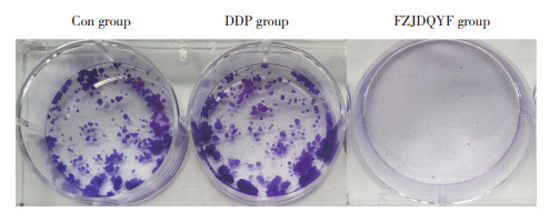 | 图 3 集落形成实验检测A549/DDP细胞集落形成情况 Fig.3 The colony formation of A549/DDP cells in each group by colony formation experiment |