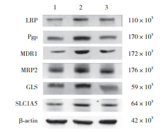 | 1, Con group; 2, DDP group; 3, FZJDQYF group. 图 4 各组A549/DDP细胞SLC1A5、GLS、MRP2、MDR1、Pgp和LRP蛋白表达 Fig.4 Expression of SLC1A5, GLS, MRP2, MDR1, Pgp and LRP proteins of A549/DDP cells in each group |