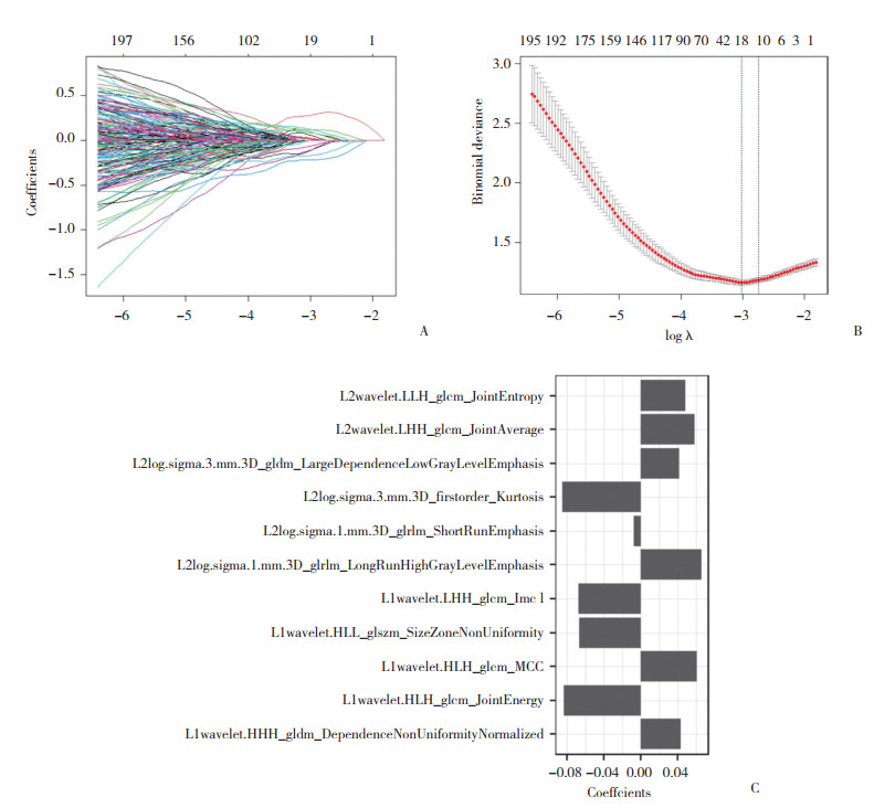 | A, radiomic features were selected by LASSO regression; B, 10-fold cross-validation was used to select adjustment parameters; C, selected features and their coefficients. 图 1 利用LASSO算法进行影像组学特征选择 Fig.1 Radiomics features were selected by LASSO regression |