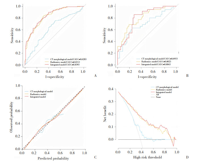 | A, ROC curves of different models in the training set; B, ROC curves of different models in the validation set; C, calibration curve in the training set; D, decision curve in the training set. 图 2 模型的性能比较 Fig.2 Performance comparison of the models |