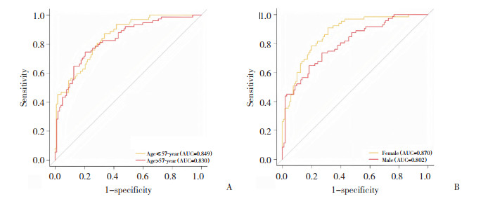 | 图 3 综合模型在各年龄(A)和性别(B)亚组中的表现 Fig.3 Performance of the model in subgroups of age (A) and sex (B) |