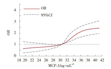 | 图 1 基于限制性立方样条模型分析MCP-1水平与CE患者EP发生的关系 Fig.1 Analysis of the relationship between MCP-1 levels and EP in patients with CE based on the restricted cubic spline model |