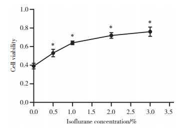 2 结果 2.1 异氟醚对H/R诱导的H9c2细胞活力的影响0.5%、1%、2%、3%异氟醚均可提高H/R诱导的H9c2细胞活力,且细胞活力随异氟醚浓度的升高逐渐提升,在浓度为2%时进入平台期,因而选择2%异氟醚进行后续细胞实验。见图 1。