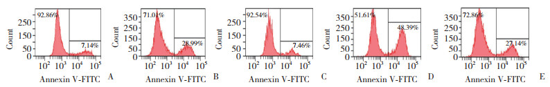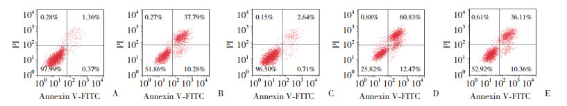 | A, control group; B, H/R group; C, isoflurane group; D, CC group; E, isoflurane+CC group. 图 2 流式细胞术检测各组H9c2细胞凋亡率 Fig.2 Apoptosis rate of H9c2 cells detected using flow cytometry in each group |