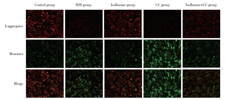与空白组相比,H/R组细胞活力、∆Ψm降低,凋亡率升高(P均 < 0.05)。与H/R组相比,异氟醚组细胞活力、∆Ψm升高,凋亡率降低;CC组细胞活力、∆Ψm降低,凋亡率升高(P均 < 0.05)。与异氟醚组相比,异氟醚+CC组细胞活力、∆Ψm降低,凋亡率升高(P均 < 0.05)。见图 2、3,表 1。