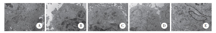 | A, control group; B, H/R group; C, isoflurane group; D, CC group; E, isoflurane+CC group. 图 4 透射电镜观察各组H9c2细胞超微结构×15 000 Fig.4 Transmission electron microscopy images of ultrastructure of H9c2 cells in each group ×15 000 |